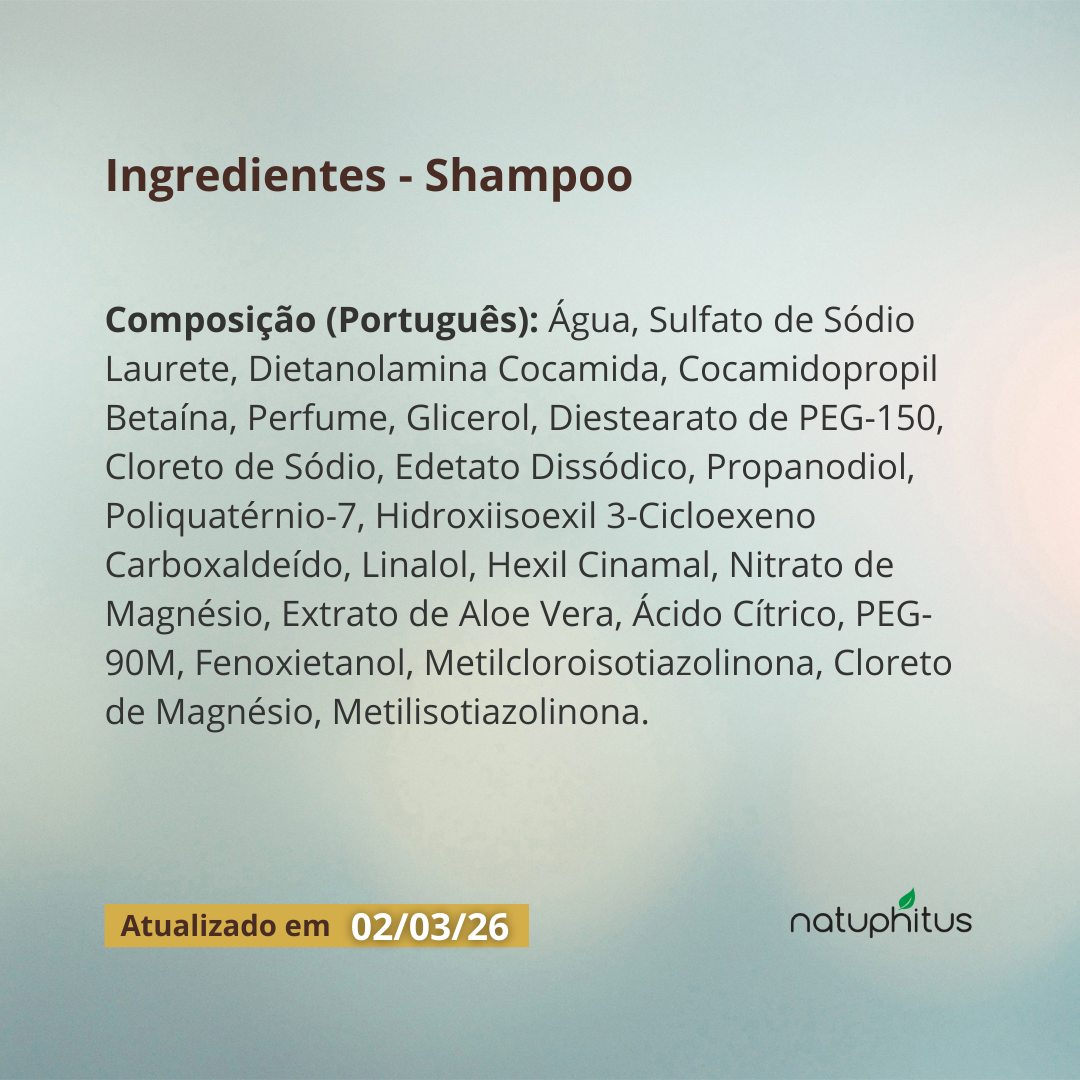 Composição Português: Água, Sulfato de Sódio Laurete, Dietanolamina Cocamida, Cocamidopropil Betaína, Perfume, Glicerol, Diestearato de PEG-150, Cloreto de Sódio, Edetato Dissódico, Propanodiol, Poliquatérnio-7, Hidroxiisoexil 3-Cicloexeno Carboxaldeído, Linalol, Hexil Cinamal, Nitrato de Magnésio, Extrato de Aloe Vera, Ácido Cítrico, PEG-90M, Fenoxietanol, Metilcloroisotiazolinona, Cloreto de Magnésio, Metilisotiazolinona.