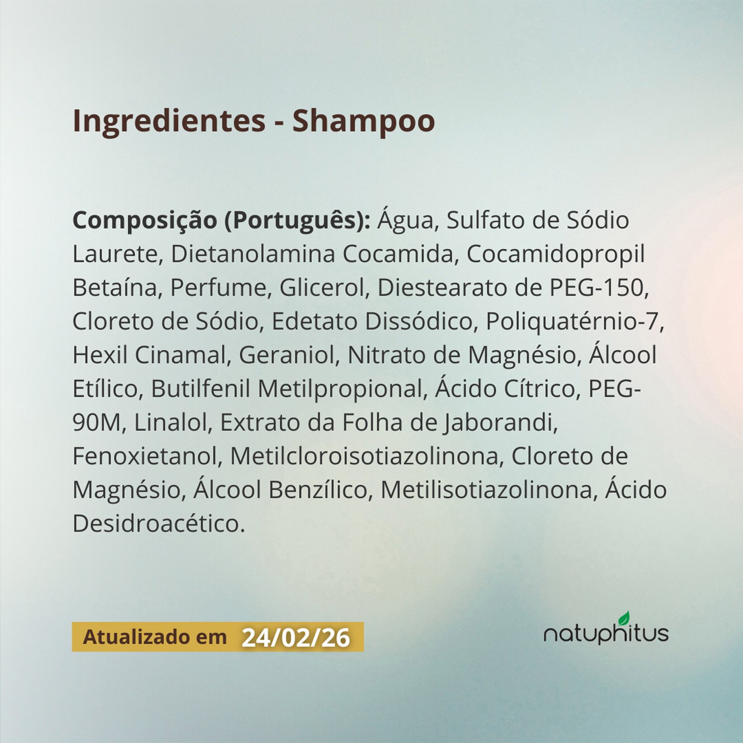 Composição: Aqua (Water), Sodium Laureth Sulfate, Cocamide DEA, Cocamidopropyl Betaine, Parfum (Fragrance), Glycerin, PEG-150 Distearate, Sodium Chloride, Disodium EDTA, Polyquaternium-7, Hexyl Cinnamal, Geraniol, Magnesium Nitrate, Alcohol, Butylphenyl Methylpropional, Citric Acid, PEG-90M, Linalool, Pilocarpus Pennatifolius Leaf Extract, Phenoxyethanol, Methylchloroisothiazolinone, Magnesium Chloride, Benzyl Alcohol, Methylisothiazolinone, Dehydroacetic Acid.