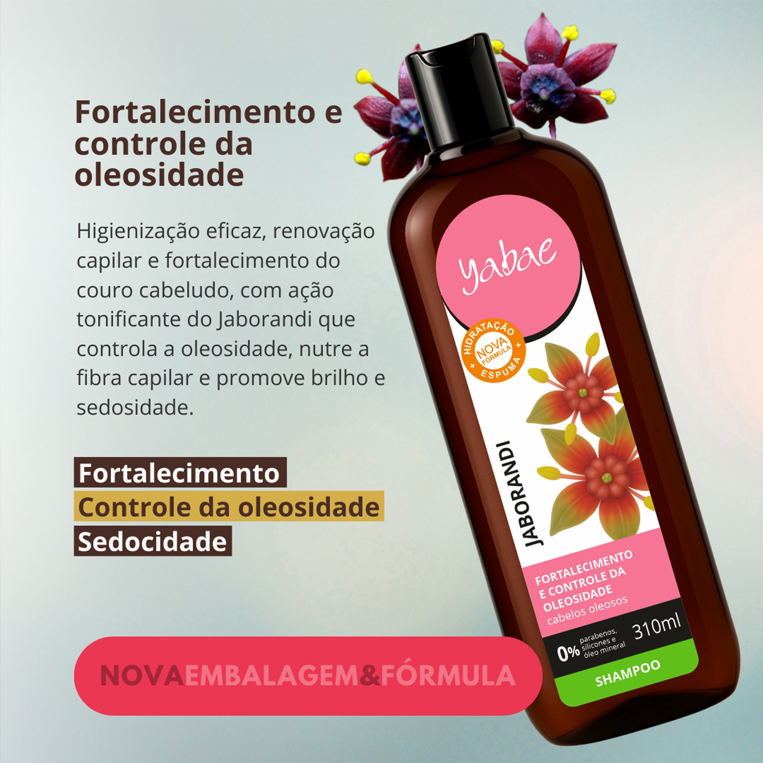 Logo nas primeiras lavagens, o cabelo ganha vitalidade e movimento, com toque leve e brilho natural. Assim, o Shampoo Jaborandi Yabae atua profundamente na limpeza, sem ressecar, mantendo o equilíbrio natural da oleosidade e devolvendo a maciez dos fios.